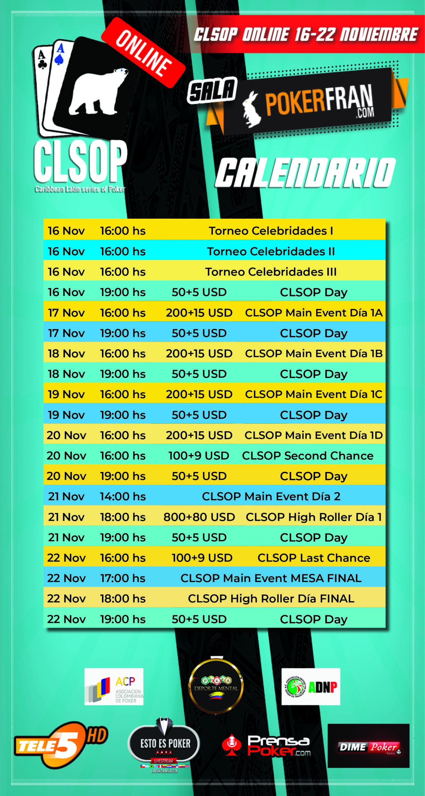 HOY LUNES 16 DE NOVIEMBRE PARTE EL CLSOP ONLINE A LAS 15:00 HORAS DE PUNTA CANA (GMT-4), SE ABRE LA ACCIÓN CON LOS TRES TORNEOS SIMULTÁNEOS DE CELEBRIDADES POR INVITACIÓN, QUE ESTARÁN COMPUESTOS POR DESTACADOS JUGADORES DE TODA LATINOAMÉRICA Y QUE PODRÁS PRESENCIAR DE MANERA TELEVISADA.